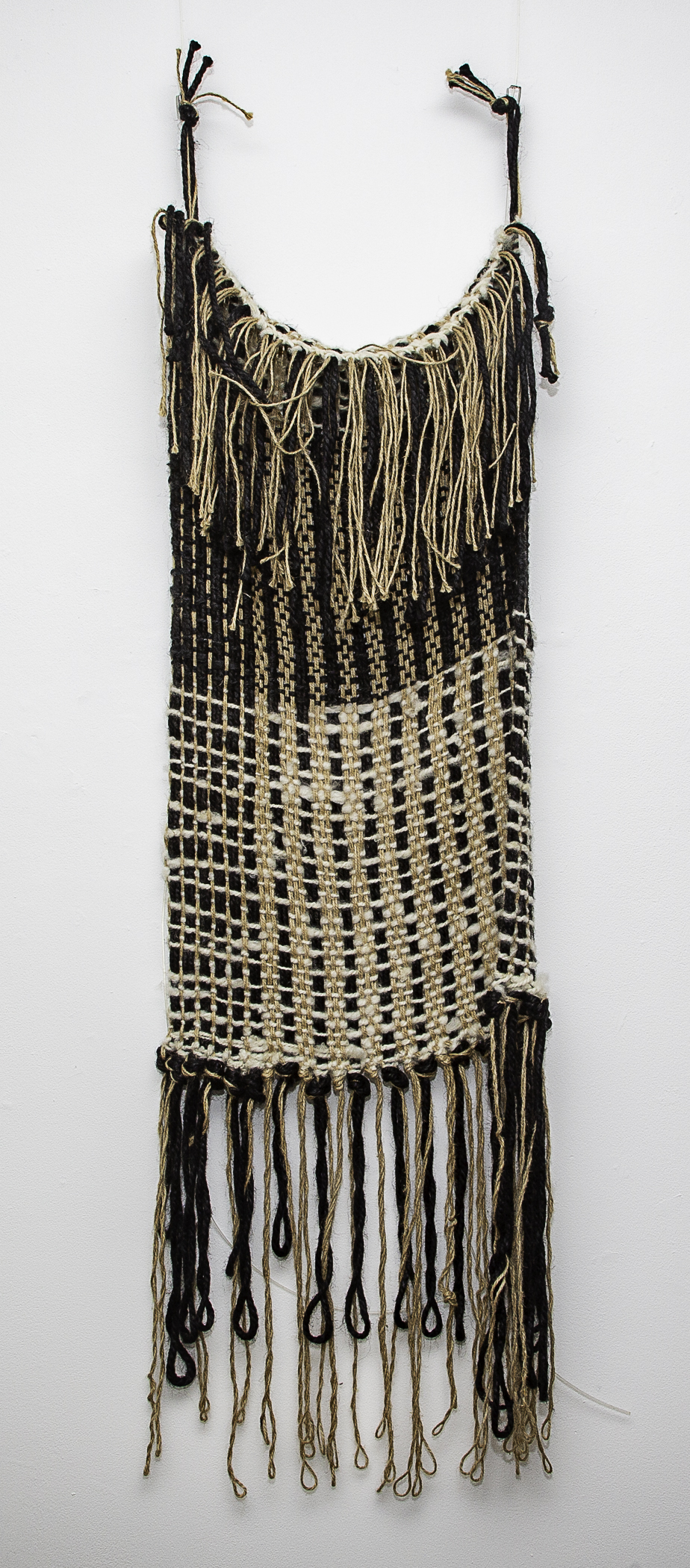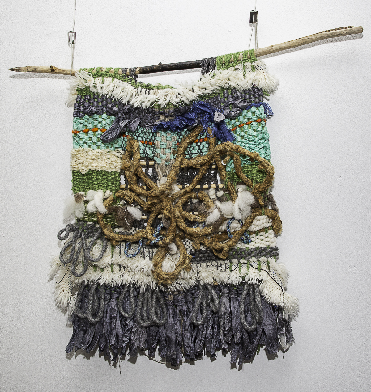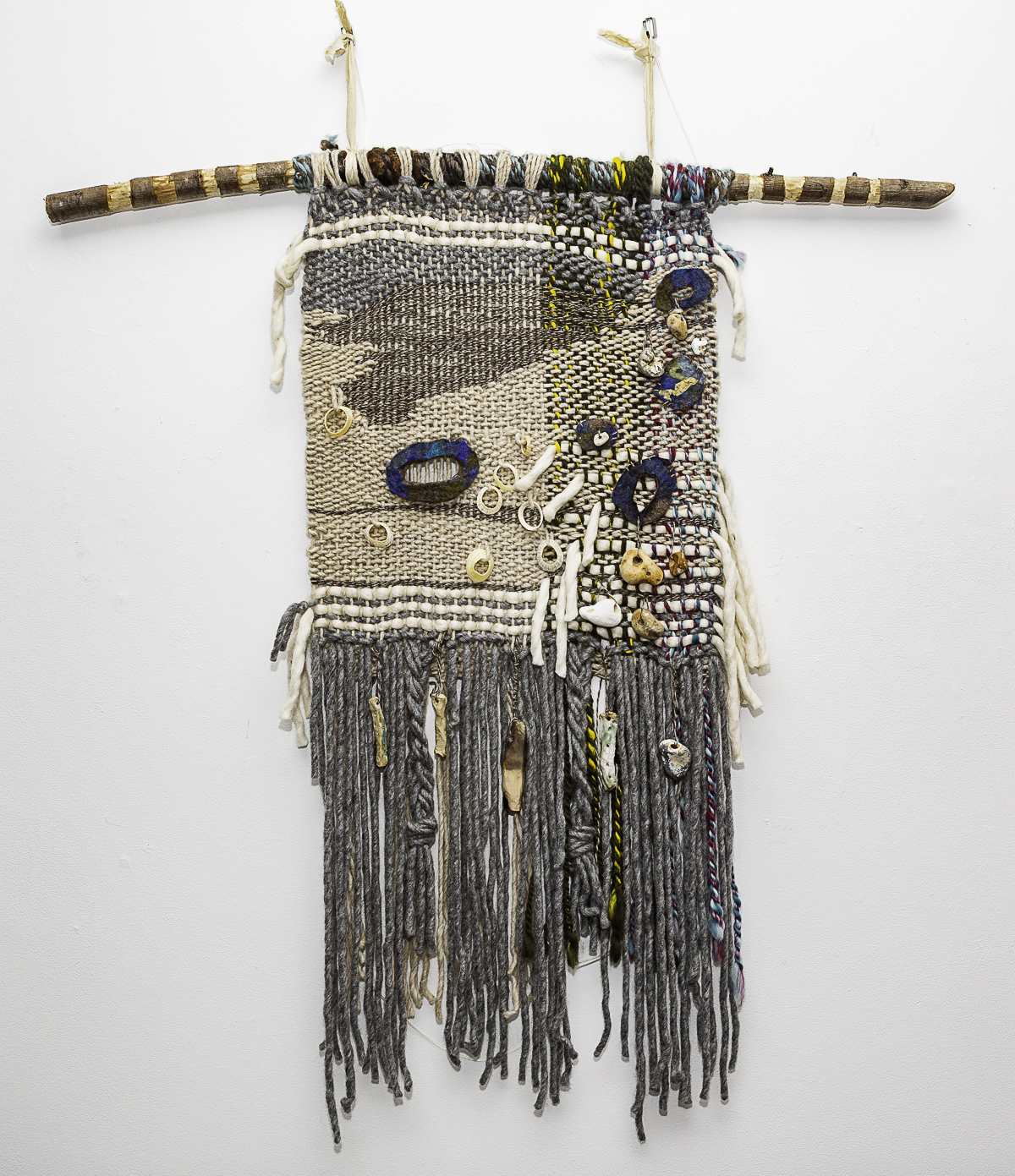 Wool, charred wood, Ceramic forms & found objects